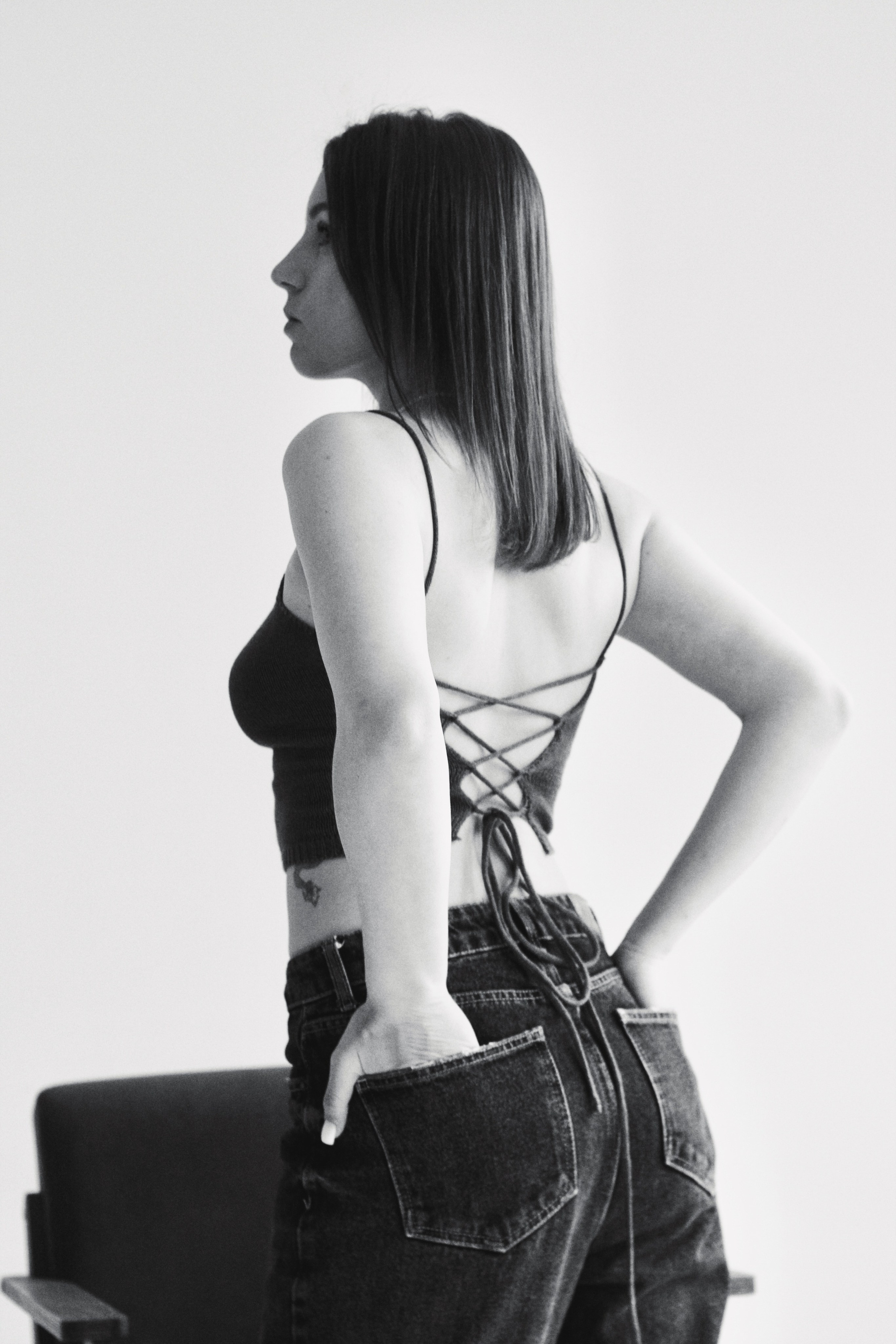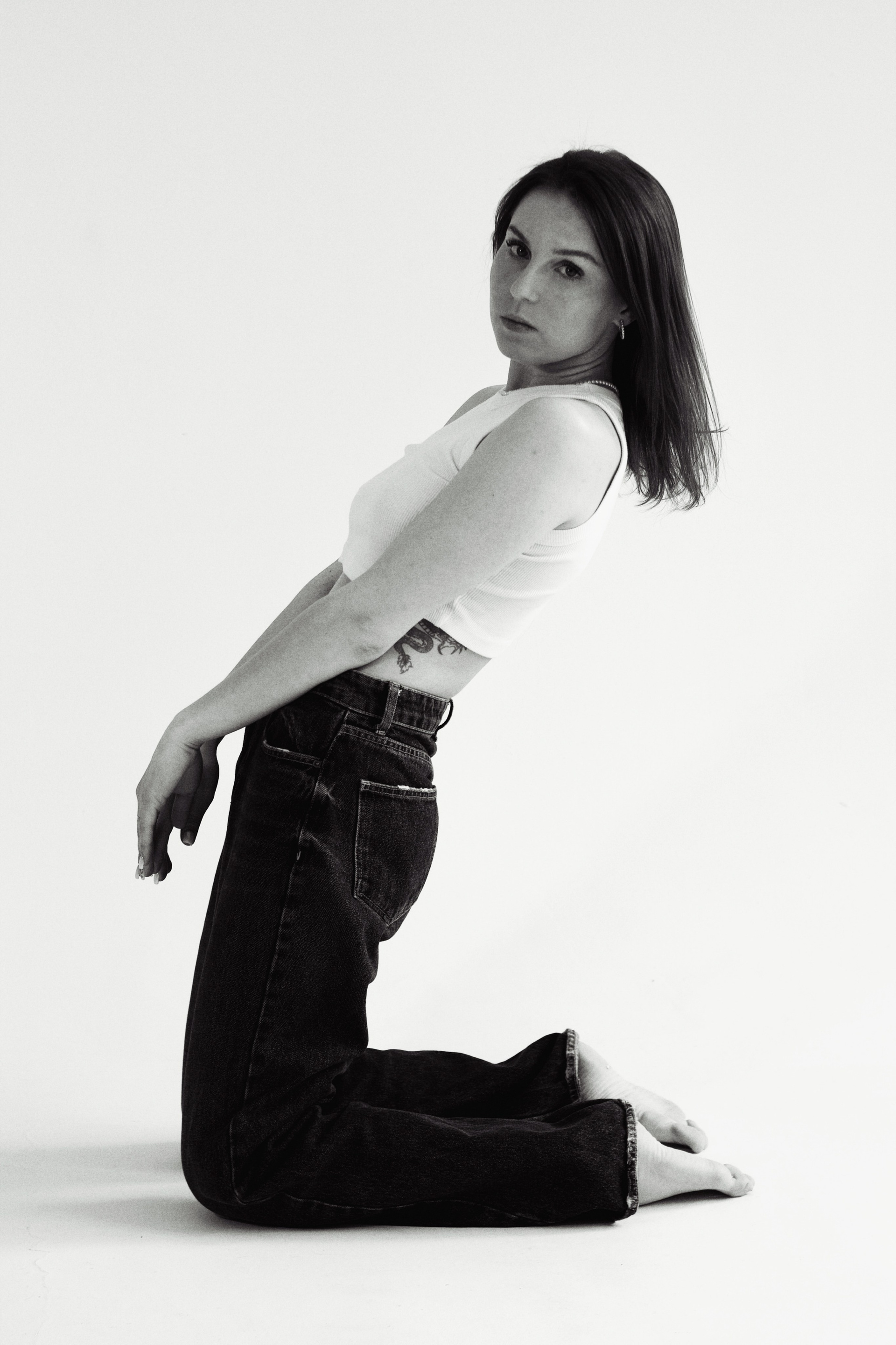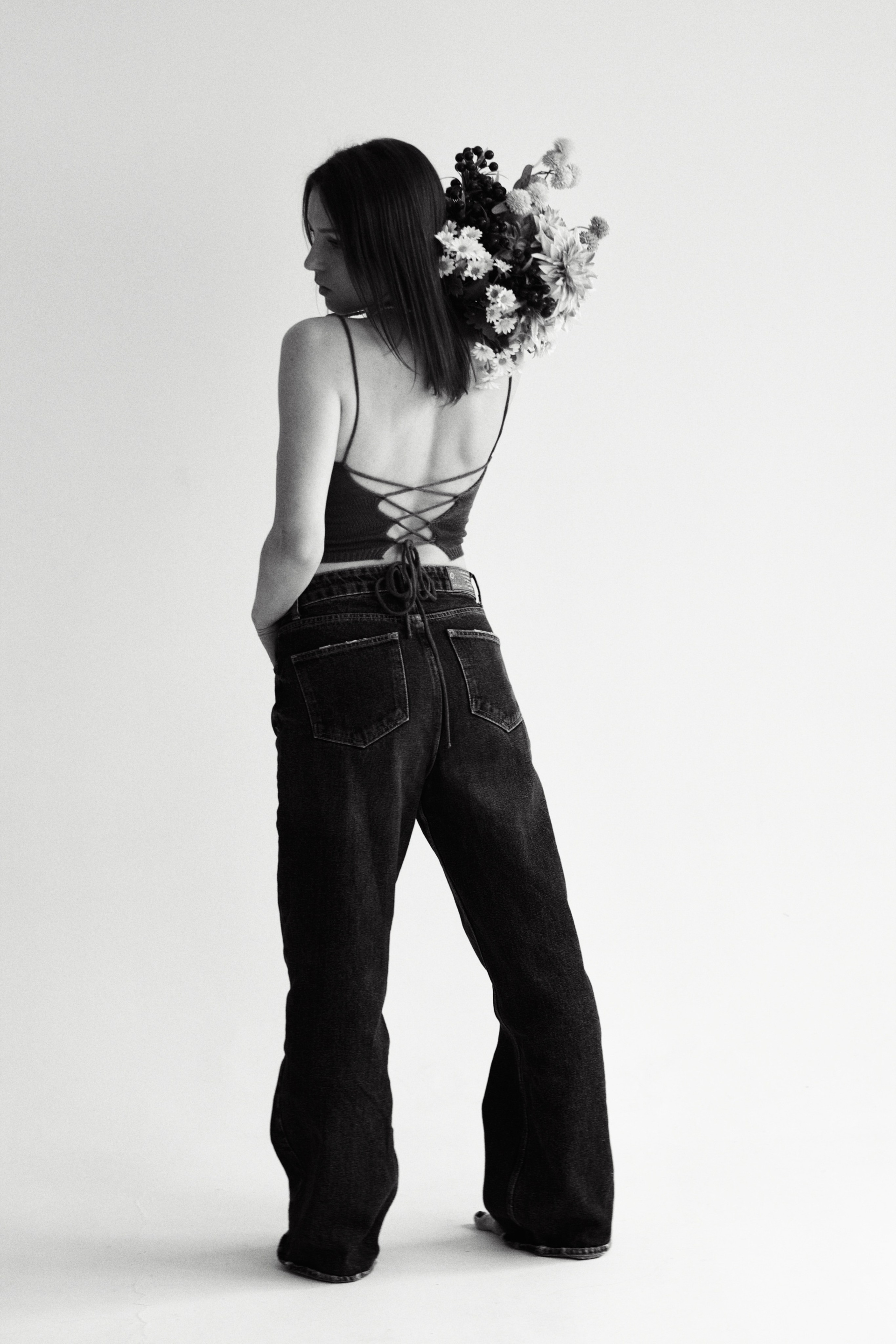Иногда белый фон — лучший рассказчик. Он не отвлекает, позволяя говорить деталям: нежному прикосновению к лепесткам, взгляду, срезу платья. Это история в чистом виде.