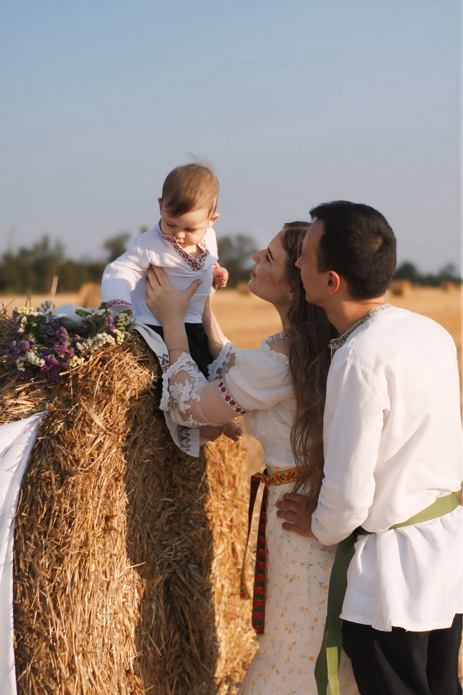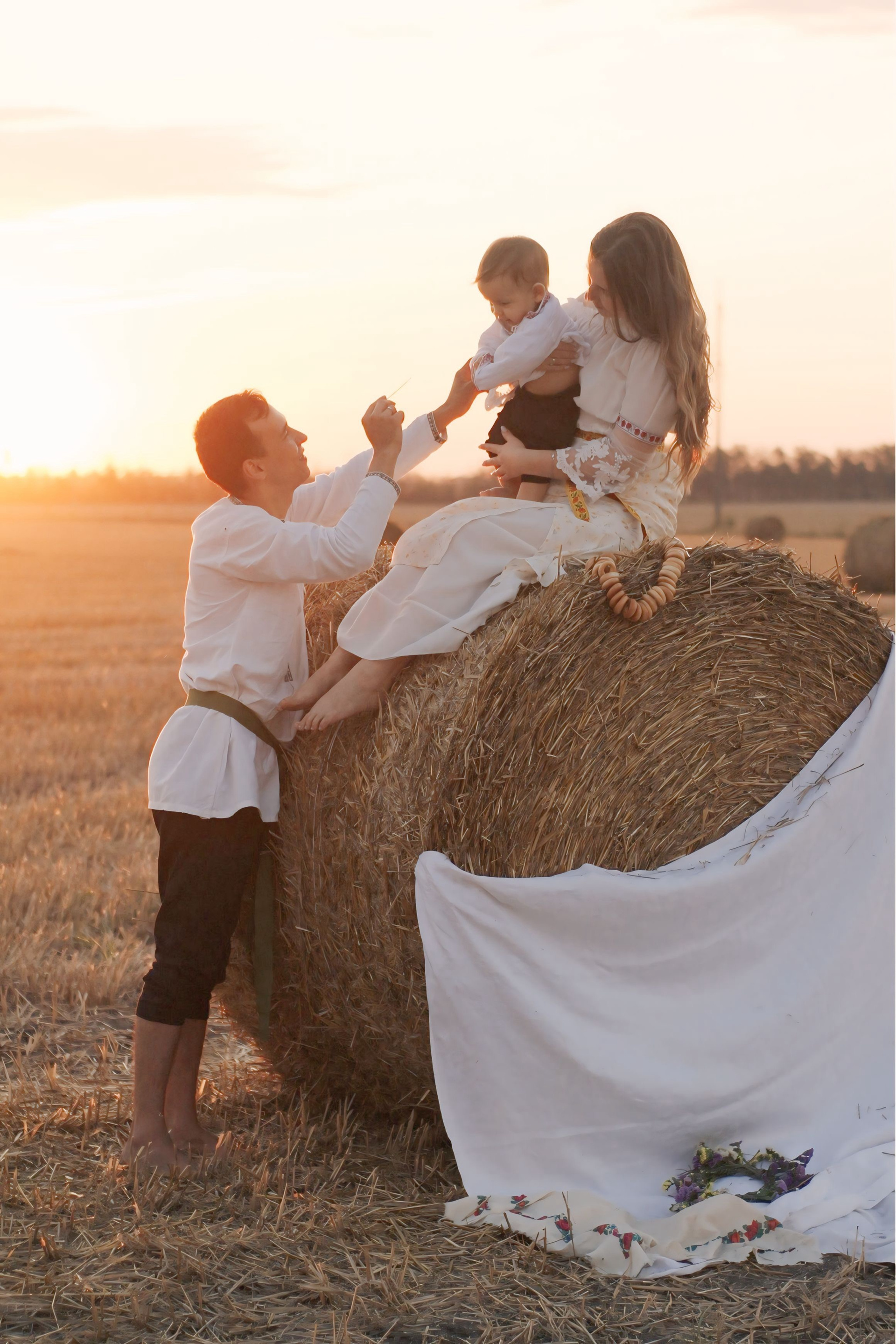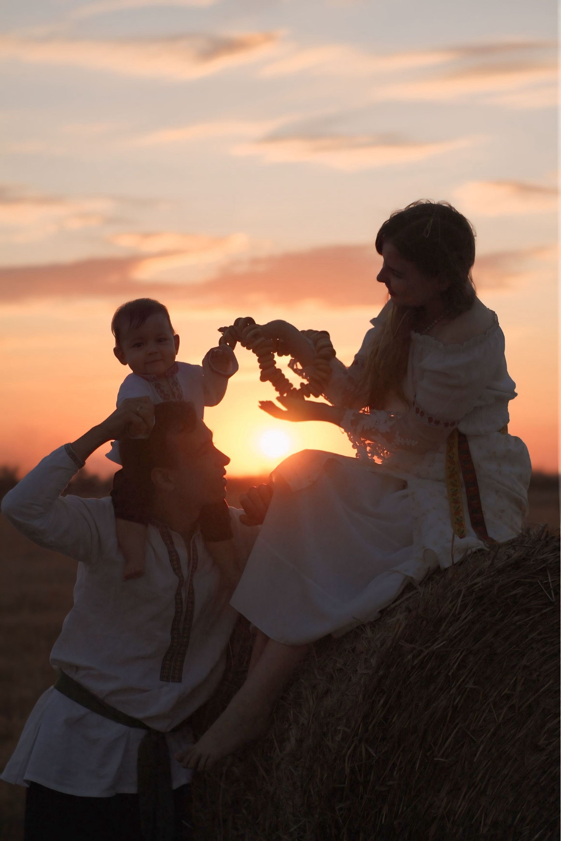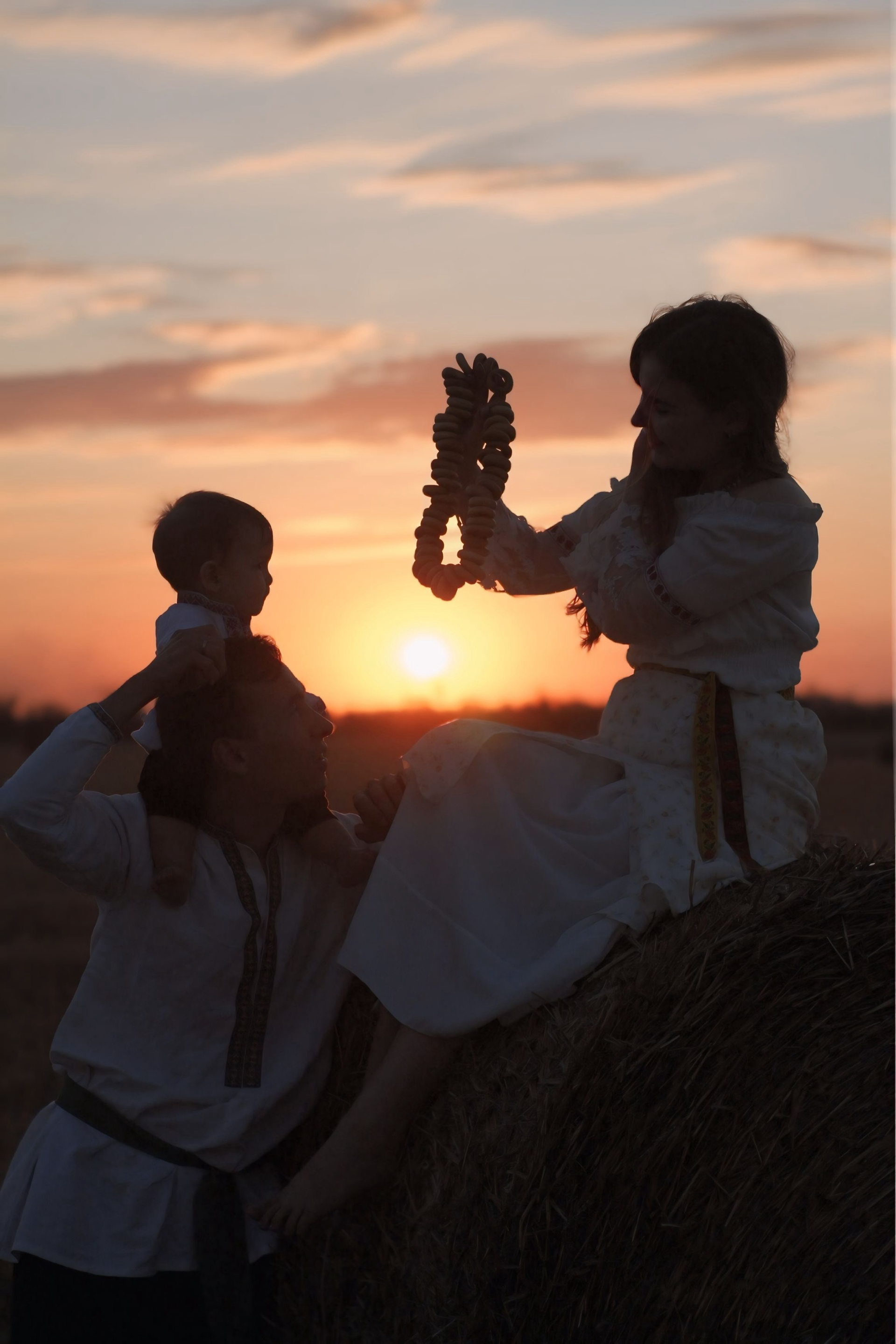 В самом сердце лета, в золотой час, когда солнце мягко опускается за горизонт, окрашивая мир в медовые тона, Ваша семья — это часть этой вечной и прекрасной картины. Пахнет скошенной пшеницей, теплой землёй и свободой. Эти стога, как тёплые крепкие объятия, хранят тепло прошедшего дня. Не в городе, а тут, на просторе, чувствуется настоящая, глубокая связь друг с другом и с этой землёй. Простое русское счастье.