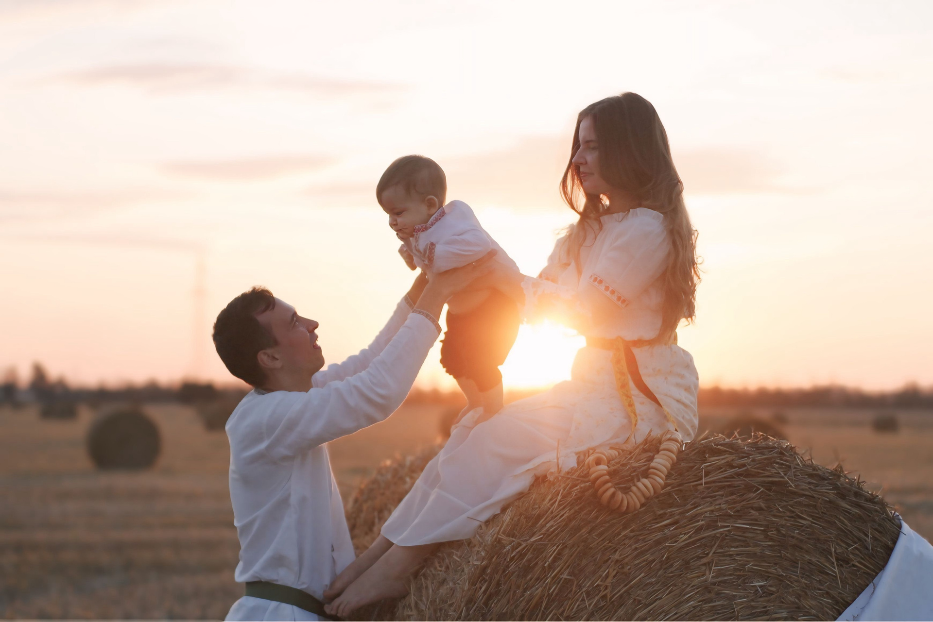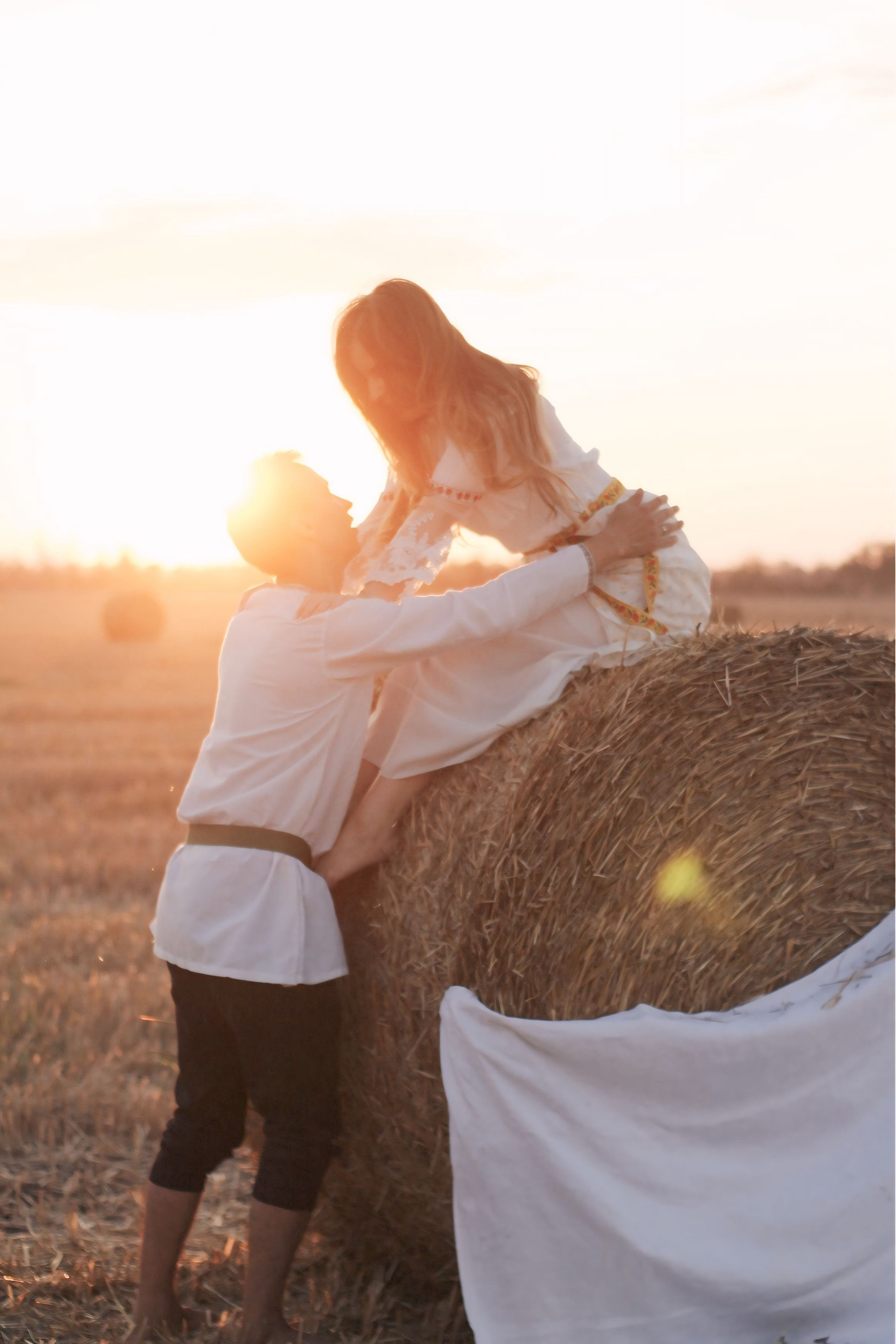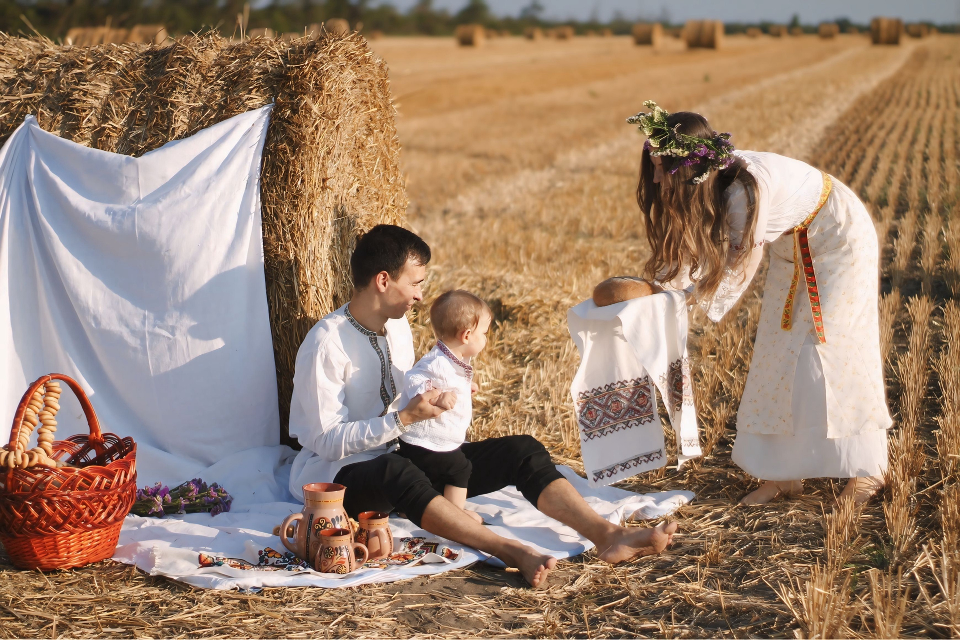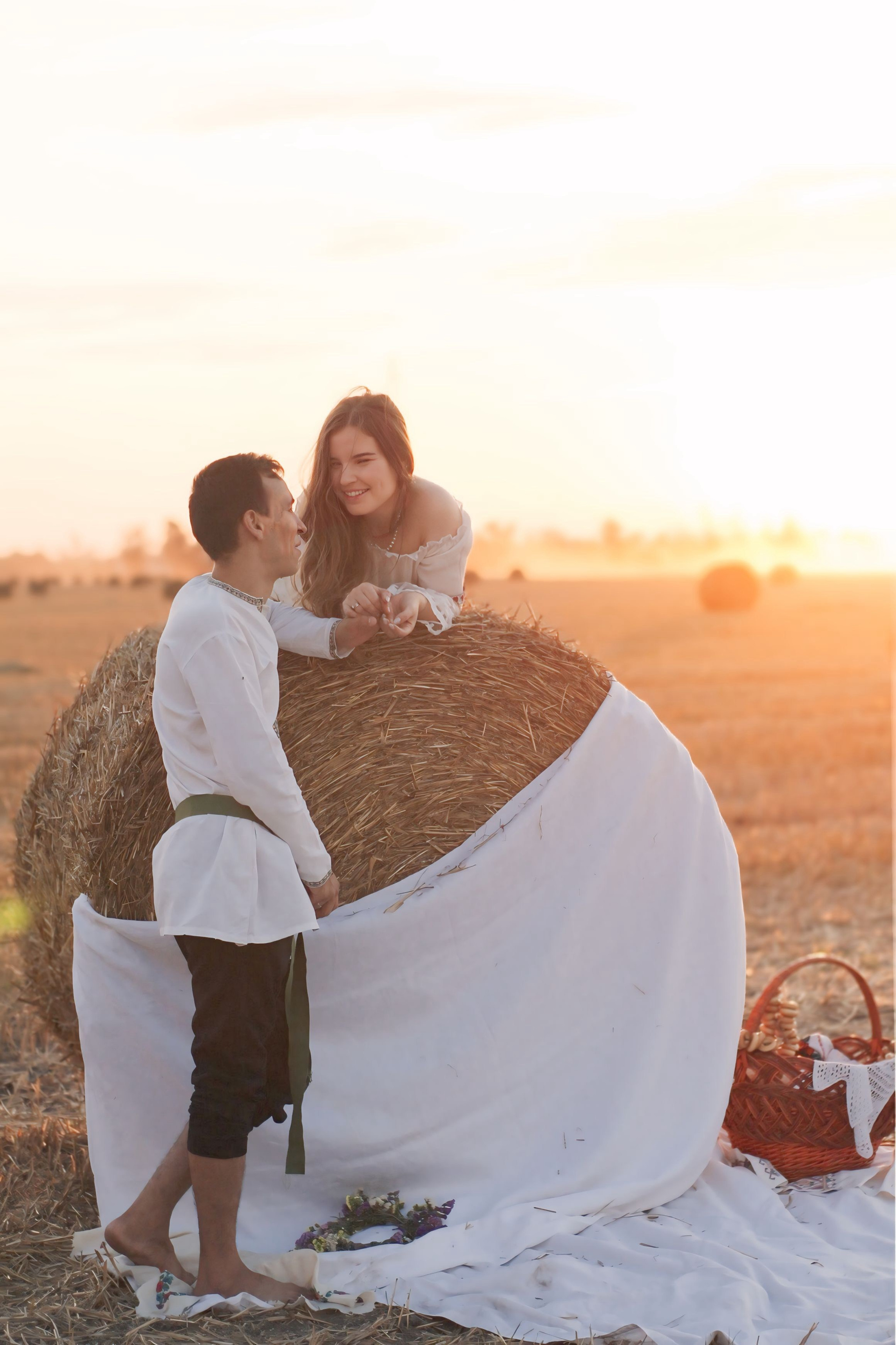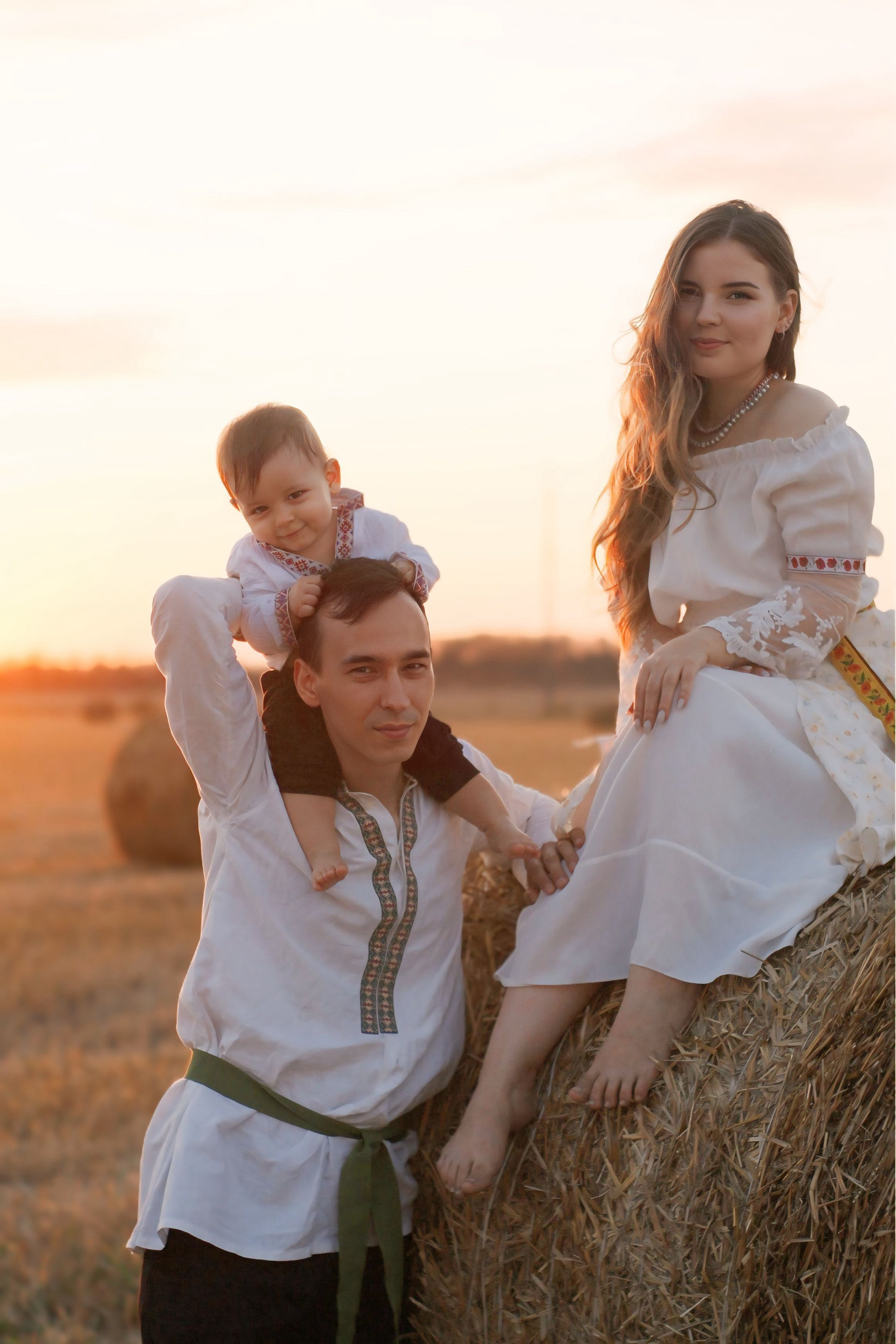 В самом сердце лета, в золотой час, когда солнце мягко опускается за горизонт, окрашивая мир в медовые тона, Ваша семья — это часть этой вечной и прекрасной картины. Пахнет скошенной пшеницей, теплой землёй и свободой. Эти стога, как тёплые крепкие объятия, хранят тепло прошедшего дня. Не в городе, а тут, на просторе, чувствуется настоящая, глубокая связь друг с другом и с этой землёй. Простое русское счастье.